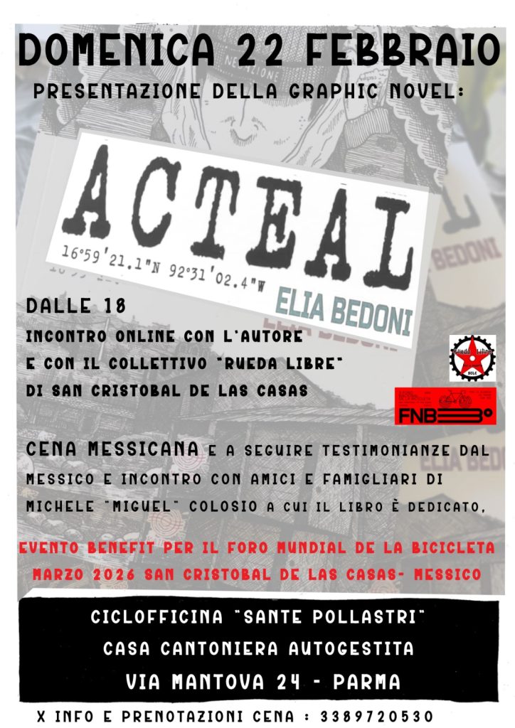 El domingo 22 de febrero se presentará la novela gráfica «Acteal» de Elia Bedoni, publicada por Kairos, bajo la curaduría del colectivo Nodo Solidale. El autor y el colectivo «Rueda Libre» de San Cristóbal de las Casas, México, participarán en línea. Habrá una cena de cocina mexicana para recaudar fondos para el Foro Nacional de la Bicicleta que se estará realizando en marzo en la San Cristóbal de Las Casas, Chiapas. También tendremos una reunión en persona con relatos de primera mano desde México, incluyendo fotos y videos, y con amigos y familiares de Michele «Miguel» Colosio, un activista italiano en México que trabaja en la educación de niños de entornos desfavorecidos, un activista de derechos humanos, un ambientalista y un activista ciclista, a quien está dedicado este libro, junto con Simón Pedro Pérez López y Samir Flores Soberanes.